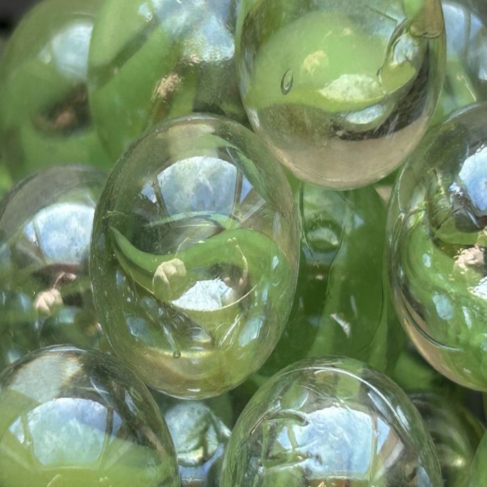 Transparenter Marmor mit einer grünen Feder im Inneren.