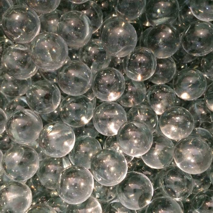 Diese Murmeln werden aus recyceltem Glas hergestellt. Dadurch sind sie nicht 100% farblos, sondern haben einen leicht getönten Glanz, den man zum Beispiel von traditionellen Colaflaschen kennt.