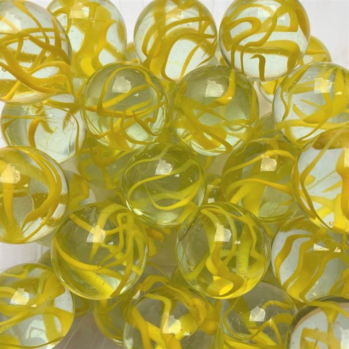 Durchscheinende Glasmurmel mit blauen Schlieren durchzogen.