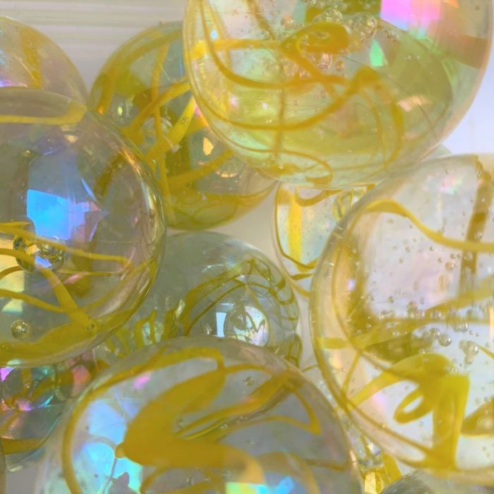 Durchscheinende Glasmurmel mit gelben Schlieren durchzogen. Diese Murmeln haben eine irisierende Beschichtung.