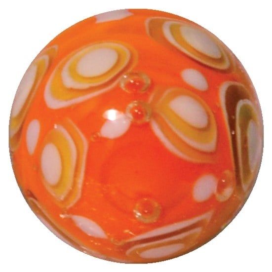 Diese handgefertigte Murmel hat einen farbigen Kern und ist mit einem Muster verziert, das an Muscheln erinnert.