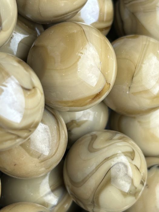 Undurchsichtige, hellbraune Murmel mit dunkelbraunen Schlieren.