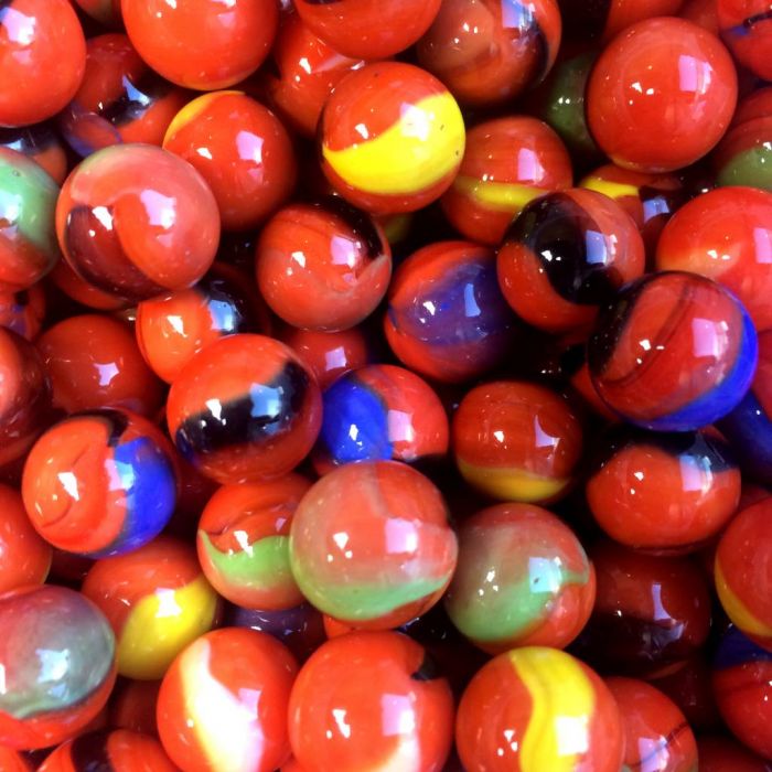 Undurchsichtige, orangefarbene Glasmurmel. Die Murmeln sind mit verschiedenen Farben, wie z.B. weiß, gelb, grün und blau verziert.