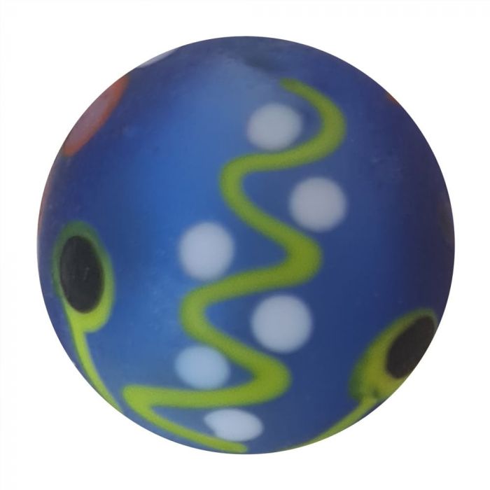 Dieser handgefertigte Murmeln hat eine transparente blaue Basis und ist mit Linien und Symbolen in verschiedenen fröhlichen Farben verziert. Die Oberfläche der Murmel ist bearbeitet, so dass sie matt ist.