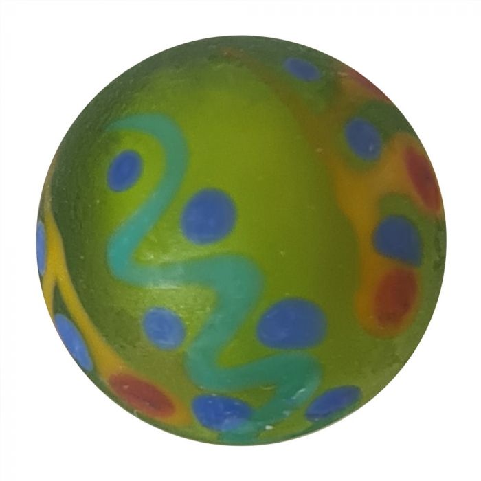 Diese handgefertigte Murmel hat eine transparent grüne Basis und ist mit Linien und Symbolen in verschiedenen fröhlichen Farben verziert. Die Oberfläche der Murmel ist so bearbeitet, dass sie matt ist.