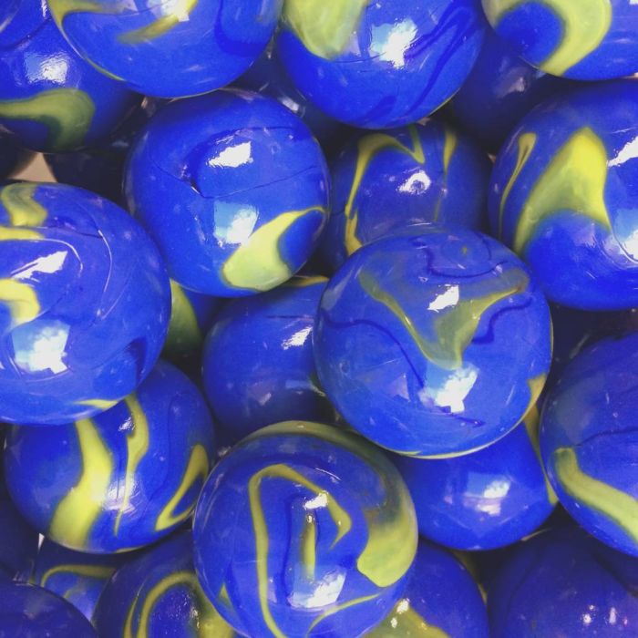 Undurchsichtige, blaue Murmel mit gelben Schlieren an der Oberfläche.