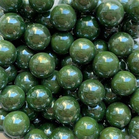 Undurchsichtige, grüne Murmel mit Perlmuttglanz-Effekt.