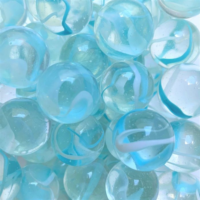 Durchsichtige Murmel mit weißen und hellblauen Streifen, die sich durch die Murmel ziehen.