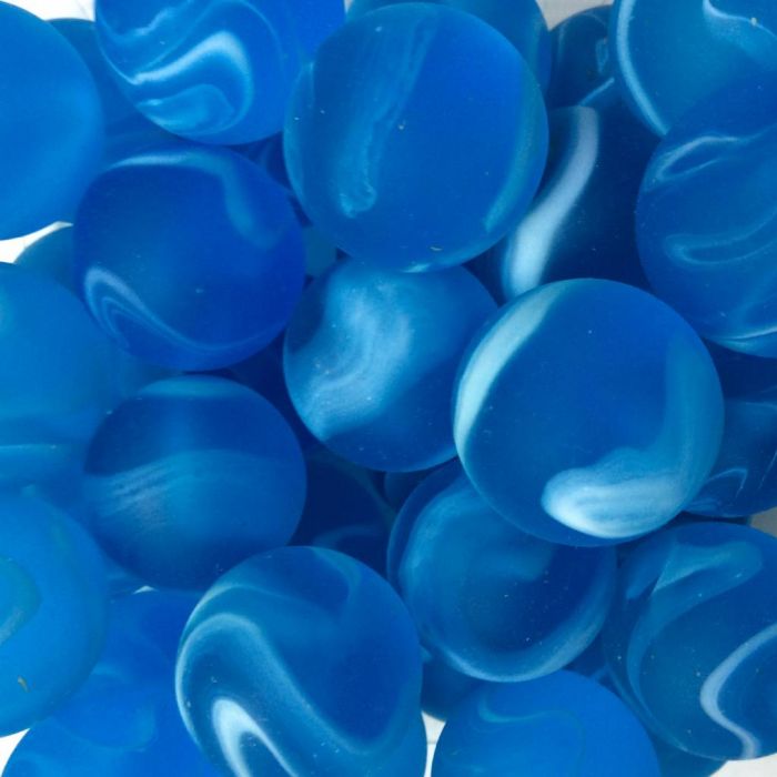 Eine matte Murmel aus hellblauem Glas, mit weißen Verwirbelungen gestaltet.