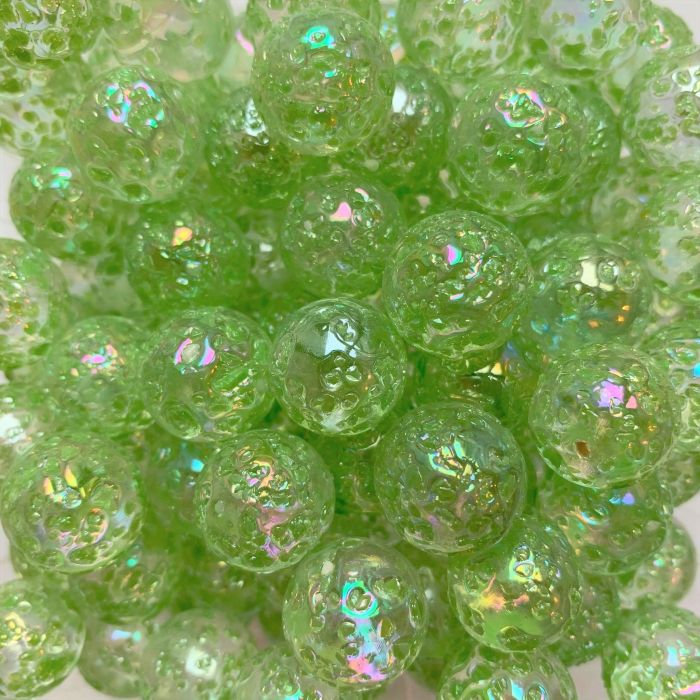 Transparente Murmel mit grünen eingeschmolzenen Glaskrümelchen.