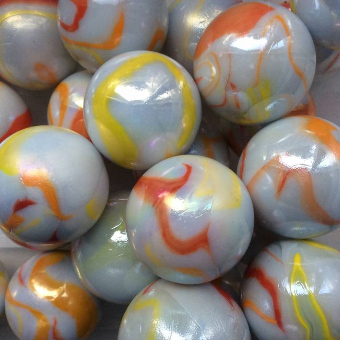 Undurchsichtige, weiße Murmel mit gelben/orangefarbenen Streifen an der Oberfläche.