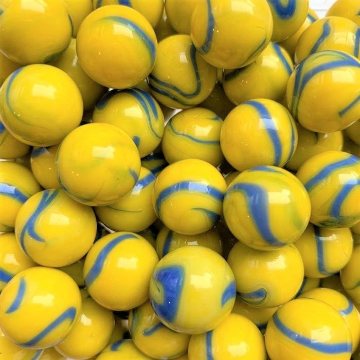 Undurchsichtige, gelbe Murmel mit blauen Schlieren an der Oberfläche.