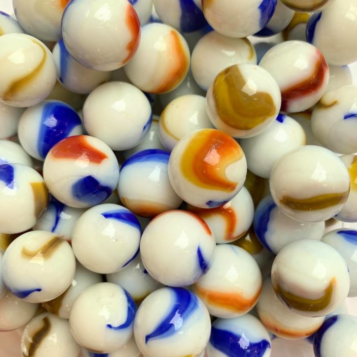 Undurchsichtige weiße Murmel mit farbigen Flecken. Die Murmeln sind mit blauen und abwechselnd ockergelben oder rotbraunen Flecken verziert.