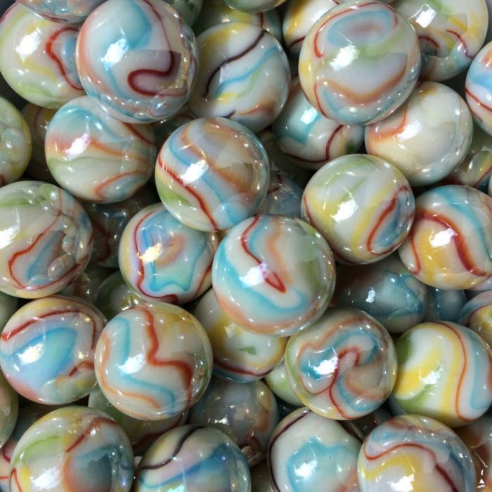 Wunderschöne, undurchsichtige, weiße Glasmurmel mit Streifen in verschiedenen bunten Farben. Diese Murmeln haben einen wunderschönen Perlmuttglanz.