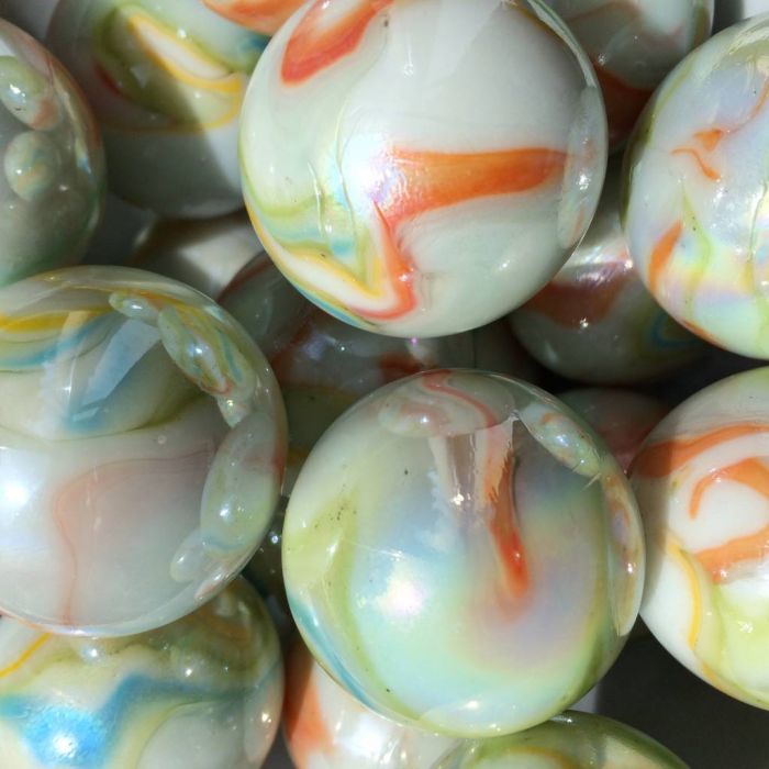 Wunderschöne, undurchsichtige, weiße Glasmurmel mit Streifen in verschiedenen bunten Farben. Diese Murmeln haben einen schönen Perlmuttglanz.