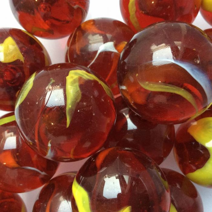 Transparente, rote Murmel mit weißen und gelben Schlieren.