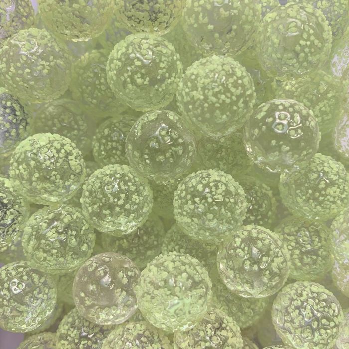 Nach der Herstellung der Murmel wird die Oberfläche erneut erhitzt und mit Leuchtpigmenten aus Glas ummantelt. Dadurch bekommt die Murmel eine unebene Oberfläche.