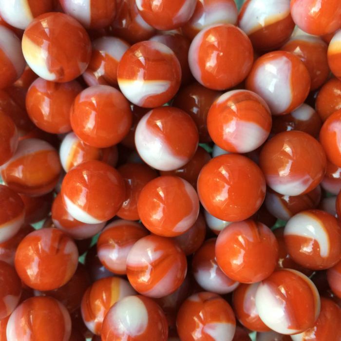 Undurchsichtige, orangefarbene Murmel mit weißen Flecken.