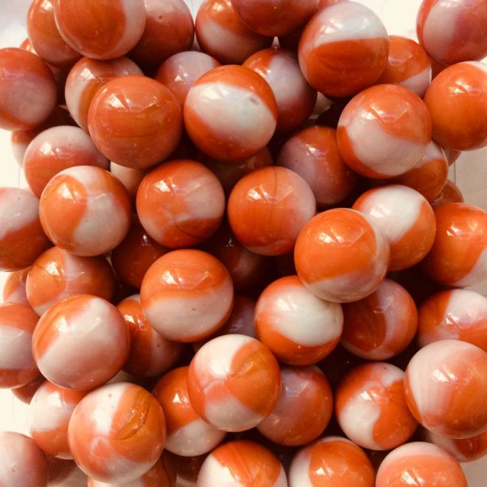 Undurchsichtige, orangefarbene Murmel mit weißen Flecken.