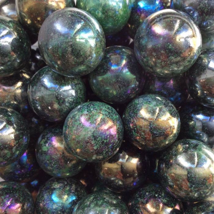 Nicht durchscheinende, schwarze Murmel mit weißen und grünen Flecken auf der gesamten Oberfläche. Diese Murmeln haben eine irisierende Beschichtung.