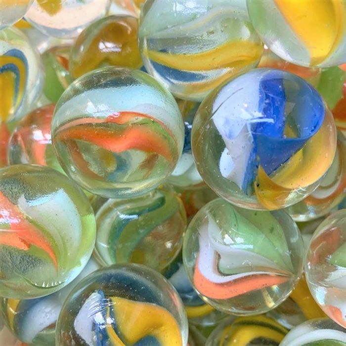 Zweifellos die berühmteste Murmel aller Zeiten: Das Katzenauge. Diese durchsichtigen Murmeln sind an den typischen kleinen Flammen im Inneren zu erkennen. Das Besondere an diesen Katzenaugen ist, dass es 3 verschiedene Farben in einer Murmel gibt, was bei modernen Murmeln nicht mehr oft vorkommt.