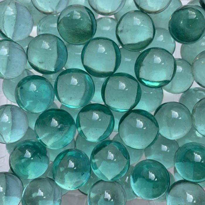 Diese Murmeln werden aus recyceltem Glas hergestellt. Dadurch können die Murmeln einen hellblauen oder hellgrünen Glanz erhalten.
