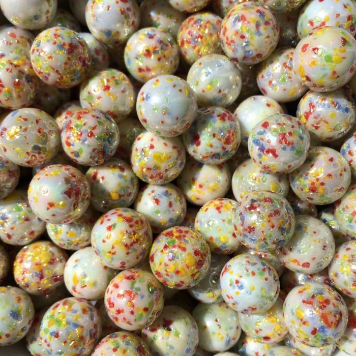 Undurchsichtige, weiße Glasmurmel mit eingeschmolzenen Glaskrümelchen in verschiedenen Farben (blau, grün, orange, gelb, rot...).