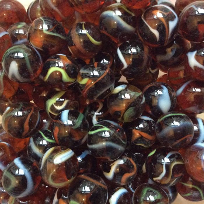 Diese Murmeln, benannt nach dem mythischen Meeresmonster, bestehen aus transparentem Braunglas, das mit weißen und grünen Schnüren veredelt ist, die über die Oberfläche und durch den Murmel laufen.