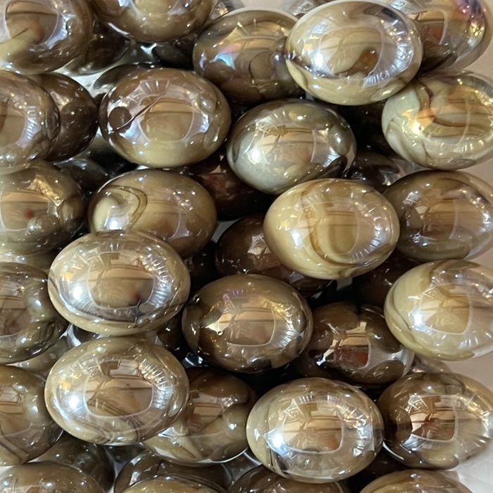 Durchscheinende hellbraune Murmel mit dunkelbraunen Linien und einer irisierenden Oberfläche