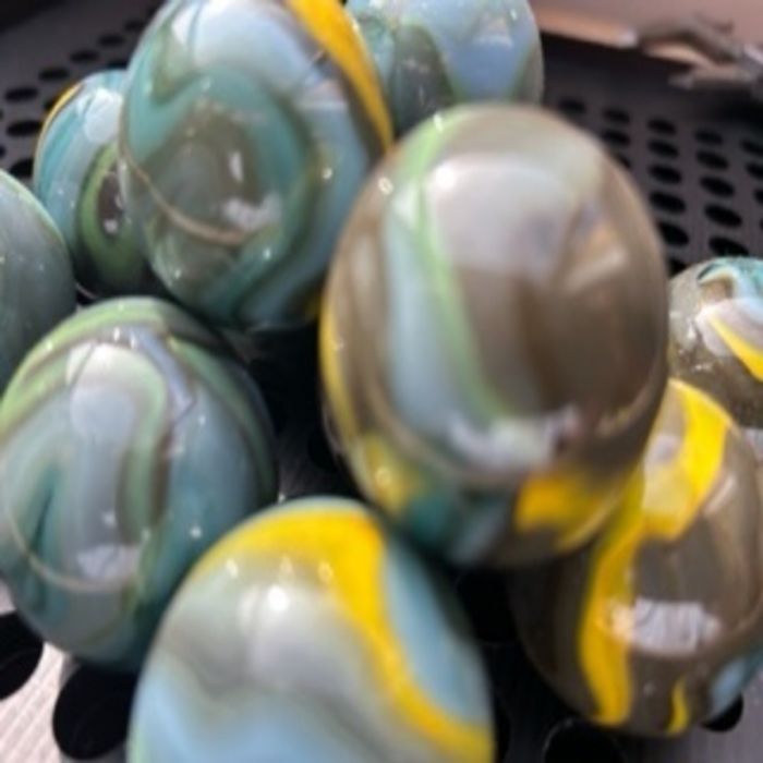 Undurchsichtige, grauer Murmel. An der Oberfläche der Murmeln verlaufen gelbe und grune Schlieren.