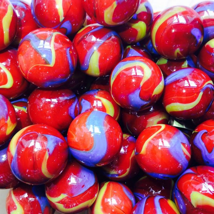 Transparente orangen-rote Kugel. Die Kugeln sind mit blauen und gelben Streifen verziert.