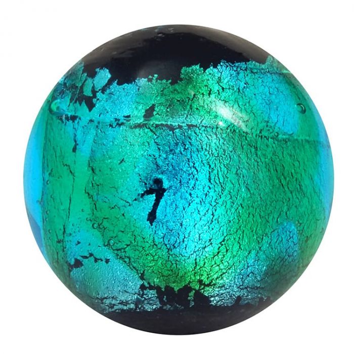 Diese handgefertigte Murmel hat einen schwarzen Kern, der mit einem farbigen Streifen bedeckt ist und mit einem eleganten Linienmuster verziert ist.