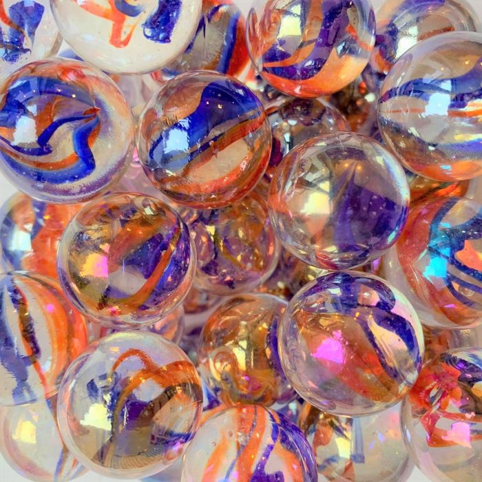 Transparente Glasmurmel mit dem schönen Katzenaugen design. Diese Murmeln haben eine irisierende Beschichtung.