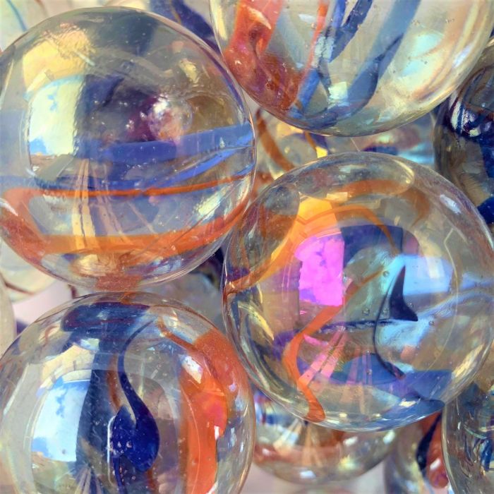 Durchsichtige Murmel mit einer rot-blauen Flamme in der Murmel. Diese Murmel ist mit einer irisierenden Beschichtung versehen, die sie noch schöner glänzen lässt!