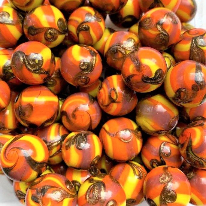 Die Murmeln haben einen durchscheinenden Kern, der von einer Spirale aus orangenem, gelbem und lilafarbenem Glas umgeben ist. Die Spirale wird von einem feinen Muster aus Goldstaub unterbrochen.