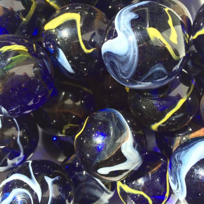 Durchscheinende, blaue Glasmurmel mit gelben, roten und weißen Schlieren.