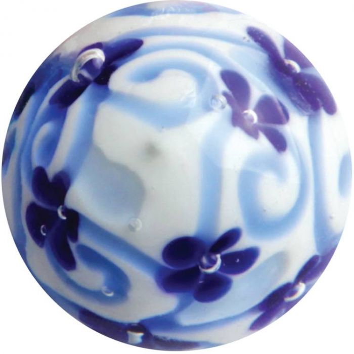 Handgefertigte glasmurmel mit kleinen Blumen und Schlieren verziert.