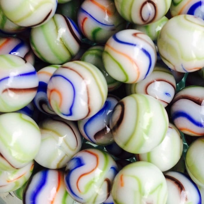 Undurchsichtige, weiße Murmel mit orangenen, braunen, blauen und grünen Schlieren an der Oberfläche.