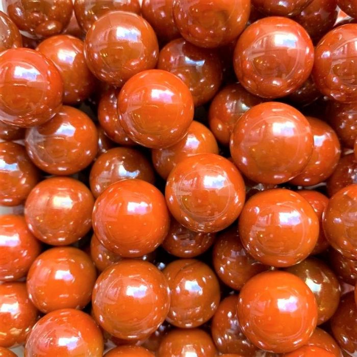 Undurchsichtige, orange Murmel mit Perlmuttglanz-Effekt.