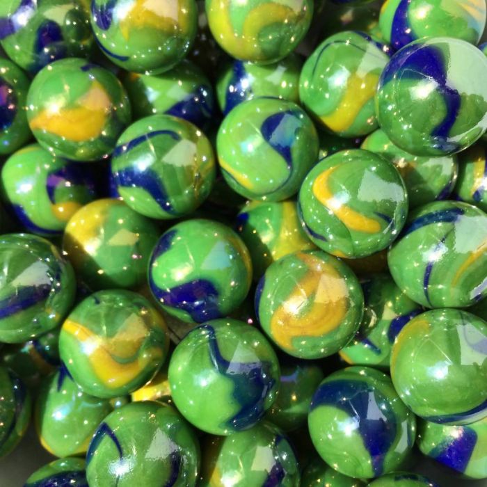 Undurchsichtige, grüne Glasmurmel mit gelben und blauen Streifen. Diese Murmeln haben einen schönen Perlmuttglanz.