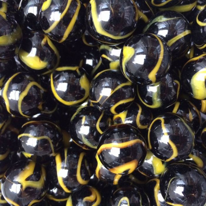 Undurchsichtige, schwarze Murmel mit gelben Schlieren.