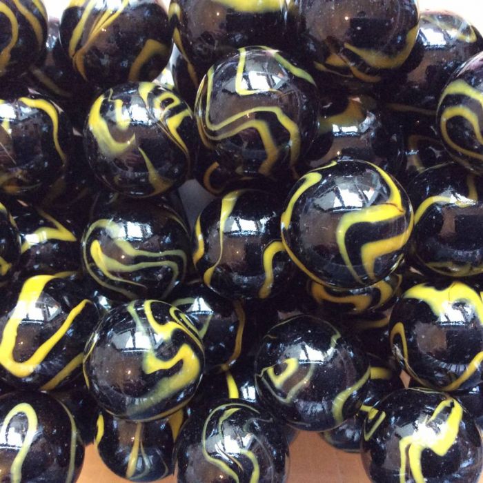Undurchsichtige, schwarze Murmel mit gelben Schlieren.