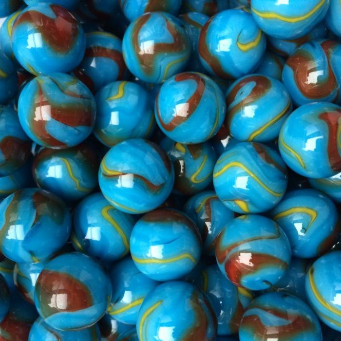 Undurchsichtige, leuchtendblaue Murmel. An der Oberfläche der Murmeln verlaufen gelbe und rote Schlieren.