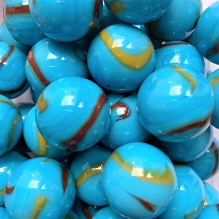 Transparente leuchtend blaue Murmel. Gelbe und rote Fäden laufen über die Oberfläche der Murmeln.
