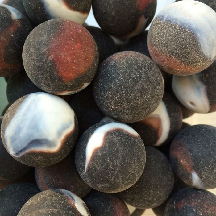 Schwarze Glasmurmel mit weißen und roten Linien an der Oberfläche. Die Murmeln haben eine matte Oberfläche.