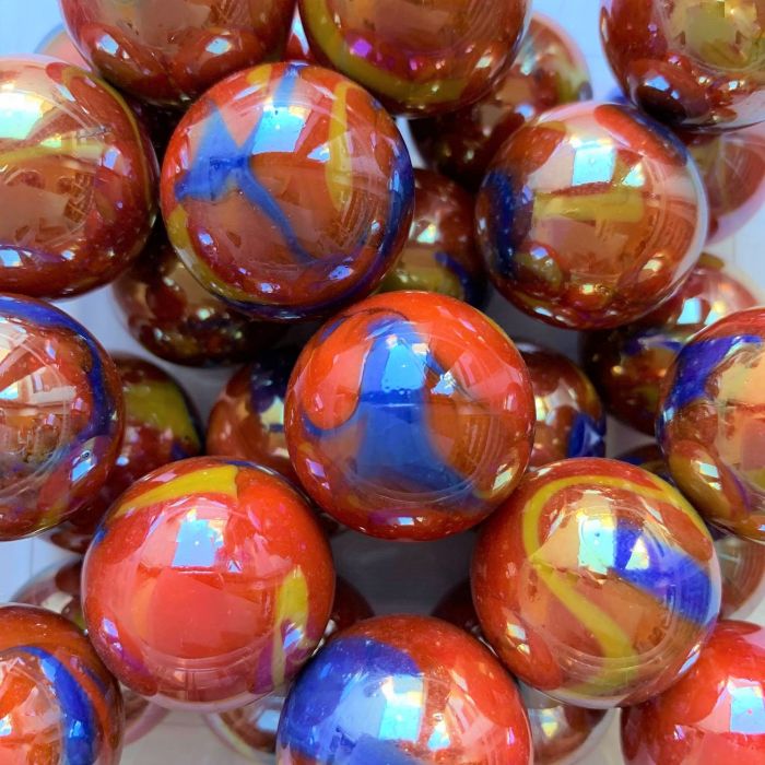 Durchsichtige orange-rote Murmel. Diese schönen Murmeln sind mit blauen und gelben Streifen und einem Perlglanz verziert.