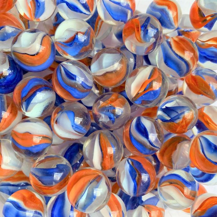 Transparente Murmel mit einem typischen dreifarbigen "Federchen" im Inneren. Das Federchen kombiniert die Farben Weiß, Rot und Blau.
