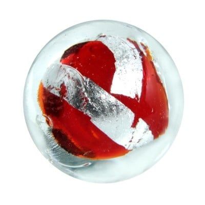 Diese handgefertigte Murmel hat einen roten Kern, der mit silbernen Streifen bedeckt ist.