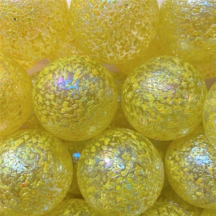 Transparente Murmel mit gelben eingeschmolzenen Glaskrümelchen.