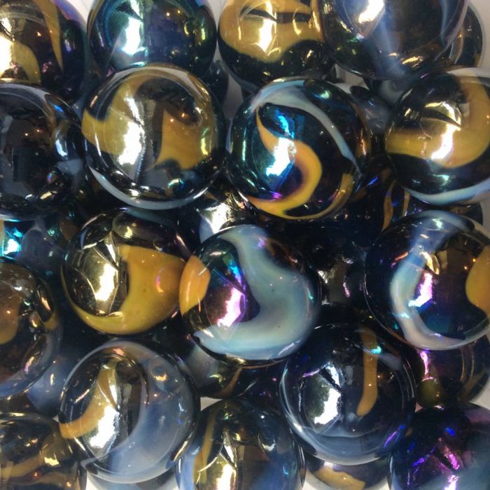 Schwarze Murmel mit weißen und gelben Linien an der Oberfläche. Diese Murmeln haben eine irisierende Beschichtung.